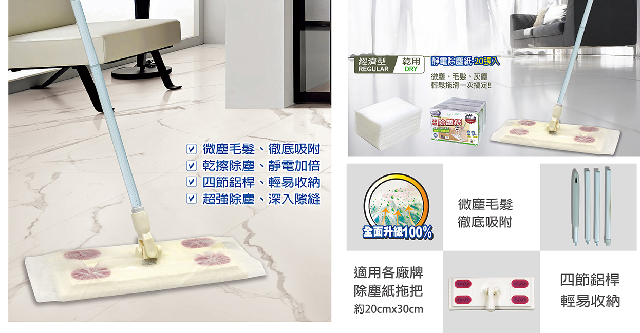 利用靜電吸附灰塵、毛髮及髒污,使用時安靜無聲!