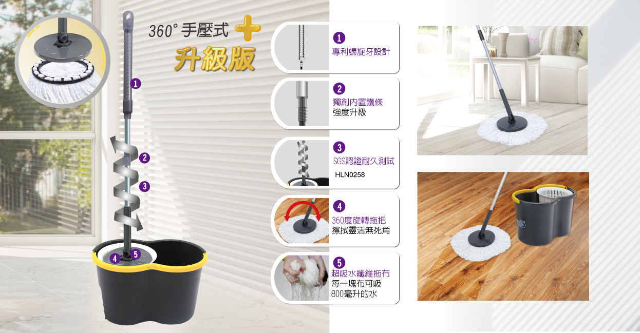 旋轉拖把結合專利螺旋牙設計與強化內置鐵條,