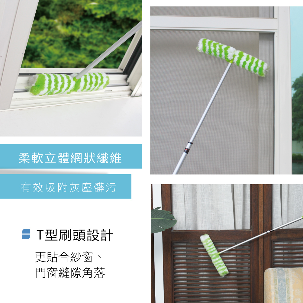 - T型刷頭設計 — 更貼合紗窗、櫥櫃頂部與角落位置,清潔更到位。