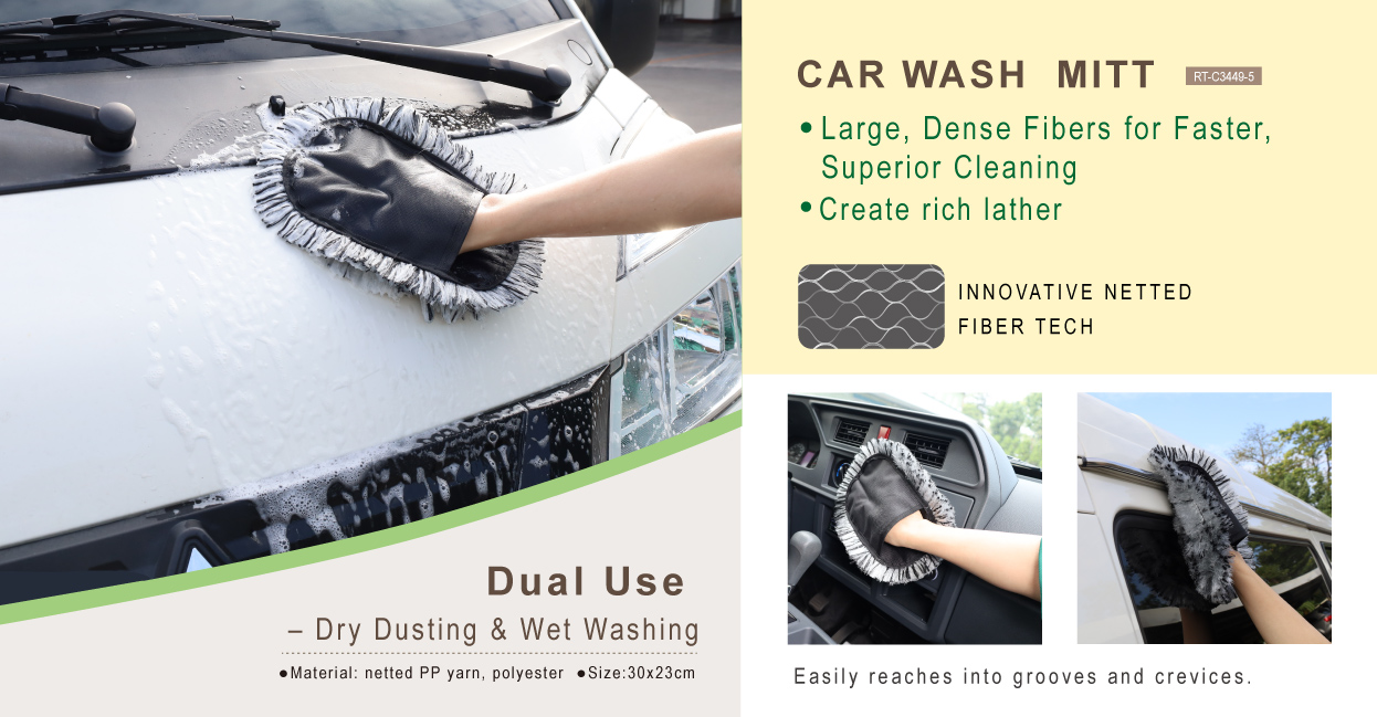 Designed for both dry and wet use, the RT-C3449-5 Car Wash Mitt is your all-in-one cleaning companion. Use it dry to remove dust and pet hair, or use it wet to create a rich lather for deep car washing. The soft netted surface creates a static charge that naturally attracts fine particles, while the plush interior ensures comfort and grip. Perfect for maintaining your car’s shine with less effort and more precision.