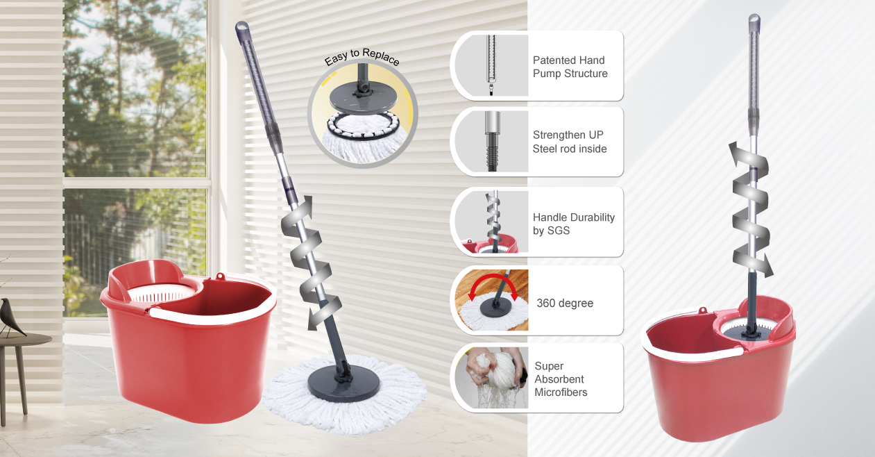 | Material | PP, PE, ABS, Microfiber, Alu. Tube, POM | Set Content | 1pc 2 section Hand Press Handle, 1pc bucket, 1pc mop head |
