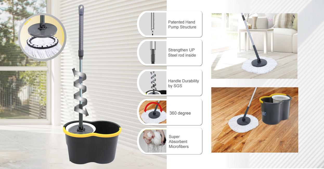 The RT-C9242 Mega Mop PAT. is designed to provide efficient floor cleaning with a convenient hand-dehydration system. The pressing mechanism allows users to remove excess water from the mop head easily without touching it directly, making the cleaning process more hygienic and comfortable.