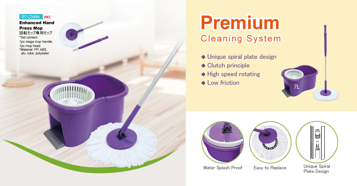The RT-C3489 Enhanced Hand Press Mop is designed to provide efficient floor cleaning with a convenient hand-press wringing system. The enhanced pressing mechanism allows users to remove excess water easily without touching the dirty mop cloth, making daily cleaning more hygienic and comfortable.