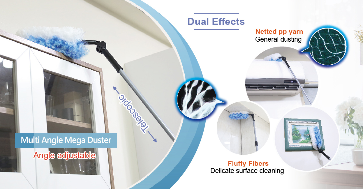 The RT-C2414-1 Multi-Angle Mega Duster is built for efficient dusting of high and hard-to-reach areas. Its bendable duster head and telescopic handle extend from 109 to 165 cm, making it ideal for cleaning cabinet tops, air conditioners, picture frames, and wall corners. The dual-sided design features soft polyester bristles for delicate surfaces and netted PP fibers for trapping dust and hair. Lightweight yet sturdy, this reusable duster is a versatile choice for both residential and commercial cleaning.