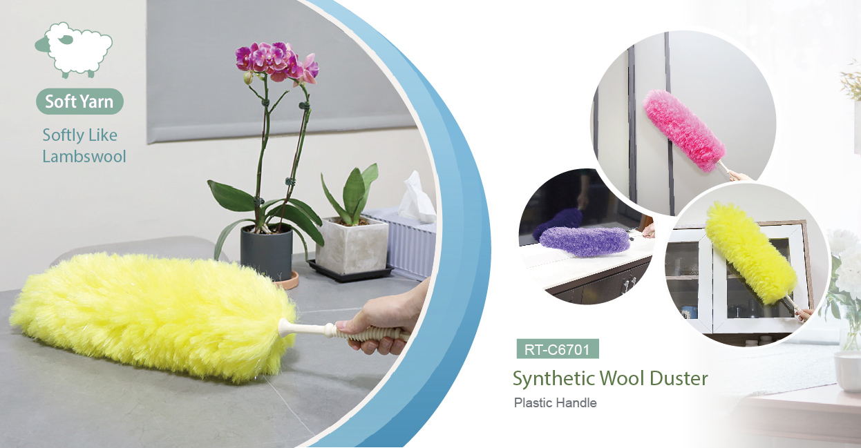 The RT-C6701 Synthetic Wool Duster features densely layered netted PP yarn with a glossy finish, offering both a refined appearance and dependable dusting performance. Though not ultra-lightweight, it has a well-balanced feel in hand and is durable enough for repeated use. Suitable for both household and commercial settings, it lifts fine dust without scratching and can be washed for long-term cleanliness and value.