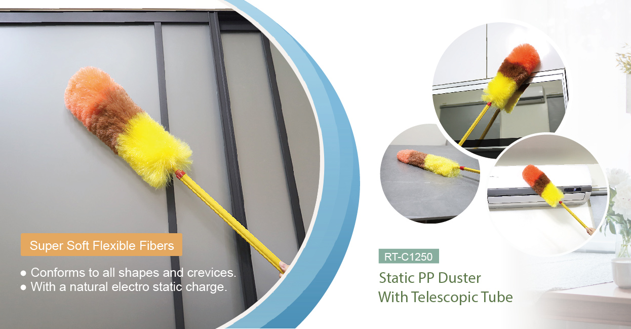 The RT-C1250 Static Duster is designed to provide maximum reach and flexibility for your daily cleaning routine. Its telescopic handle extends from 84 to 114 cm, making it perfect for dusting ceiling corners, fan blades, and high shelves. Crafted with static-charged PP bristles, it effectively lifts and traps dust, lint, and hair without the need for sprays. The soft, flexible bristles are safe for use on various surfaces, while the uniquely reinforced grip ensures stability during use. A washable, reusable choice for eco-conscious cleaning.