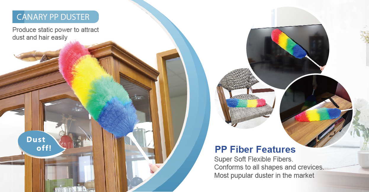 The RT-C6100 Canary PP Duster is a top-selling classic designed for quick, effective household cleaning. Its vibrant rainbow color and fluffy PP fibers are not just eye-catching—they’re highly functional. The electrostatic charge generated during use attracts dust and pet hair with ease, leaving surfaces spotless without the need for chemical sprays. Lightweight, soft, and gentle on surfaces, this duster is ideal for blinds, shelves, furniture, and tight corners. A reliable, reusable solution for everyday dusting.